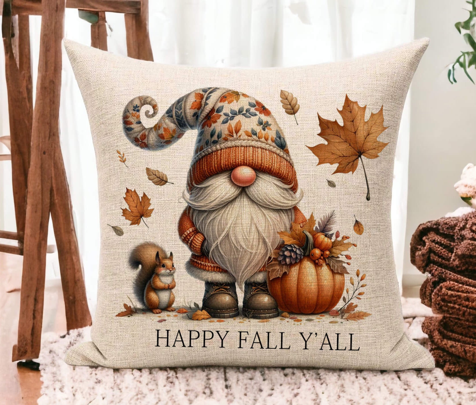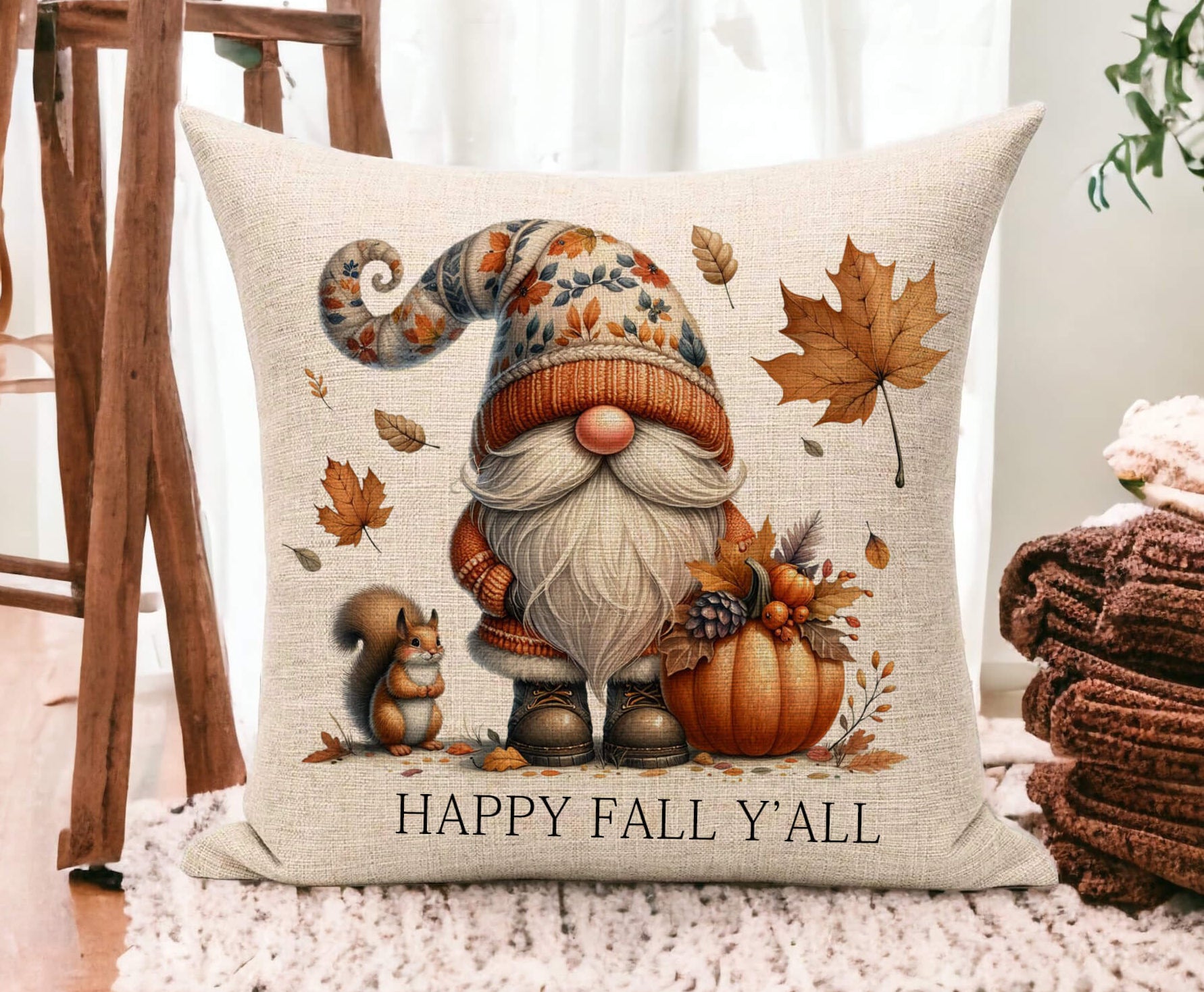 Cozy up your space with this adorable Personalized Fall Gnome Pillow, featuring a charming woodland gnome surrounded by autumn leaves, pumpkins, and a squirrel companion. With the phrase "Happy Fall Y’all", it brings rustic farmhouse charm to any room — perfect for couches, entryways, or seasonal gift-giving. Pillow comes without text at bottom, add your desired text for bottom in place of text shown on display.