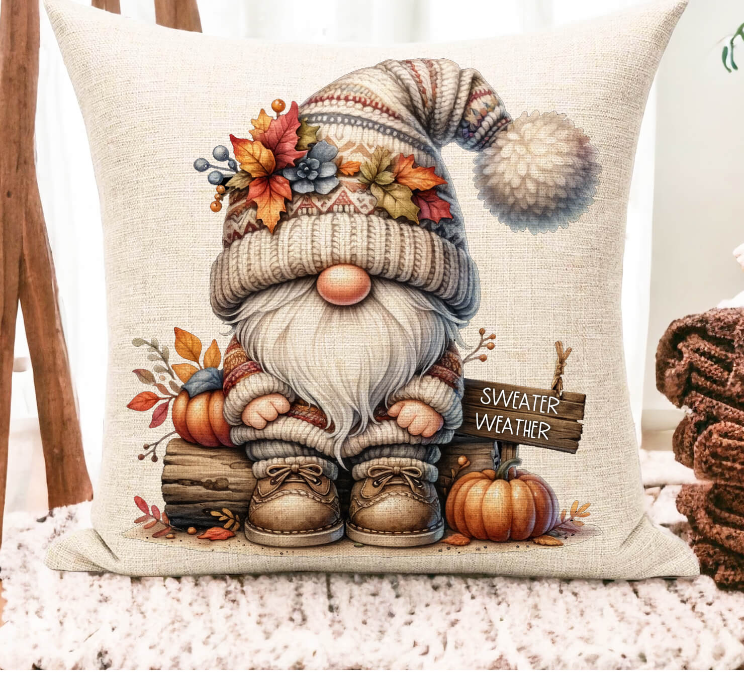 Featuring a whimsical gnome in a chunky knit hat decorated with autumn leaves, berries, and pumpkins, this pillow is the perfect accent for farmhouse, rustic, or boho fall décor. Your family name or favorite phrase is custom printed on a wooden-style sign for a one-of-a-kind seasonal keepsake.