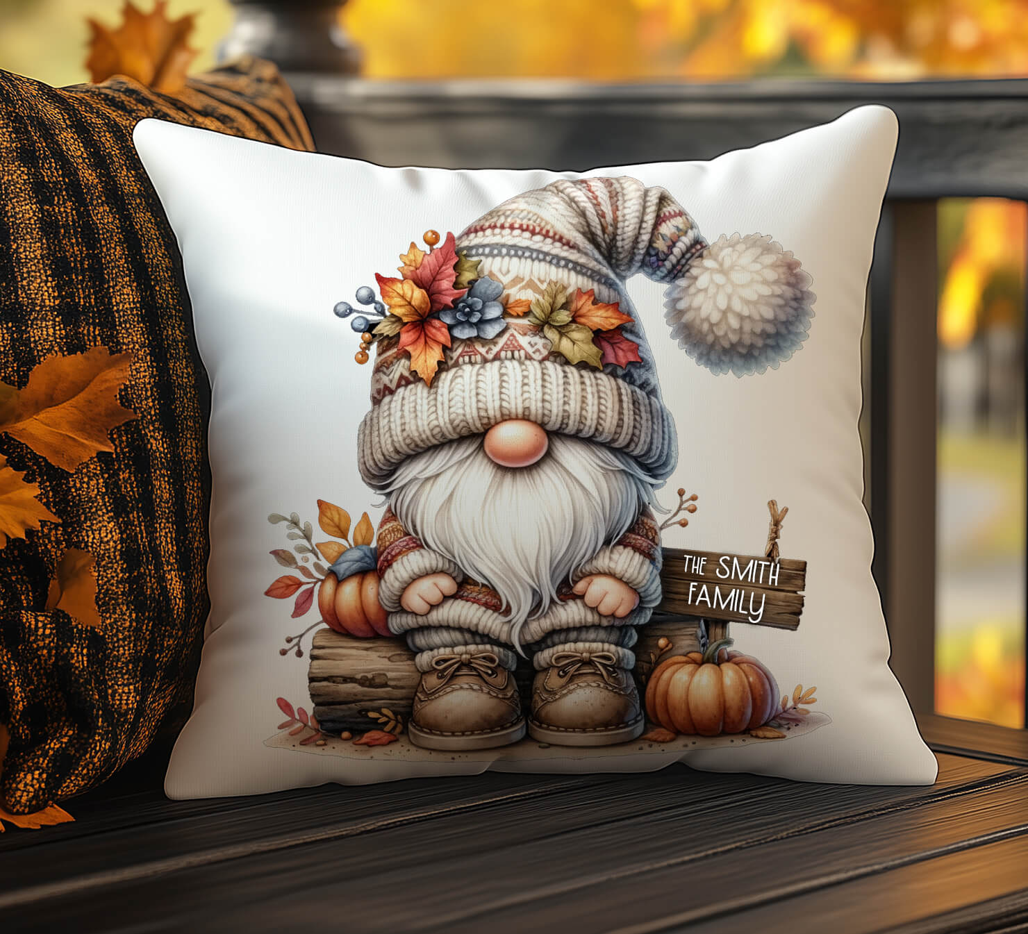 Bring cozy autumn charm to your home with this personalized fall gnome pillow.