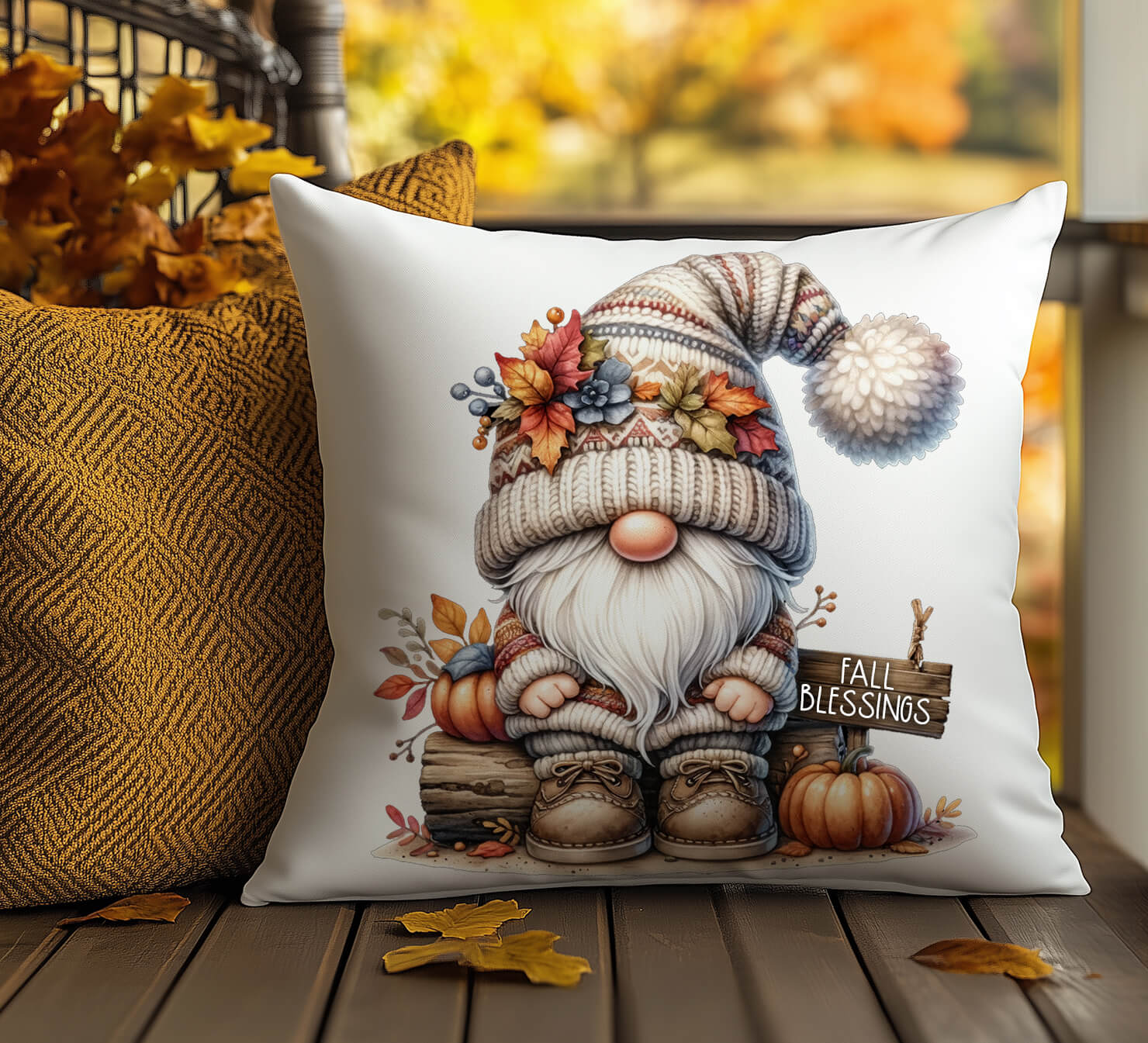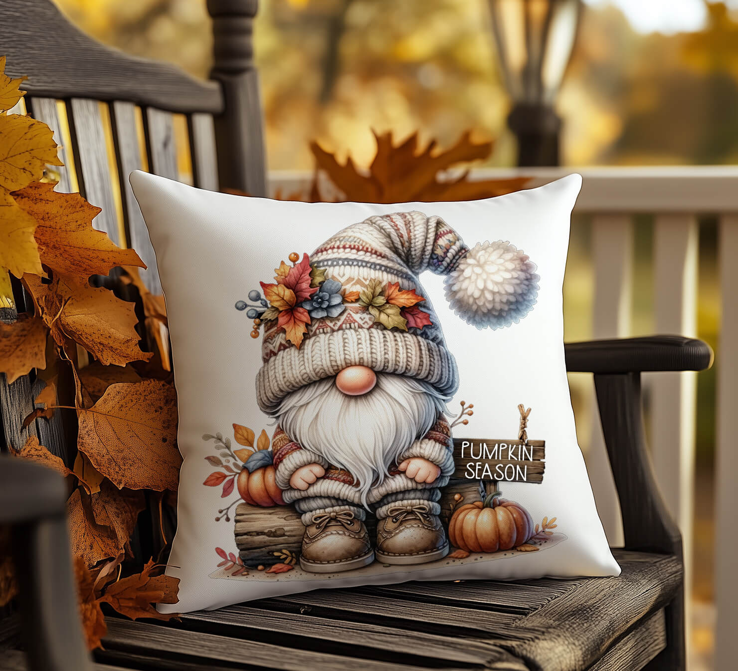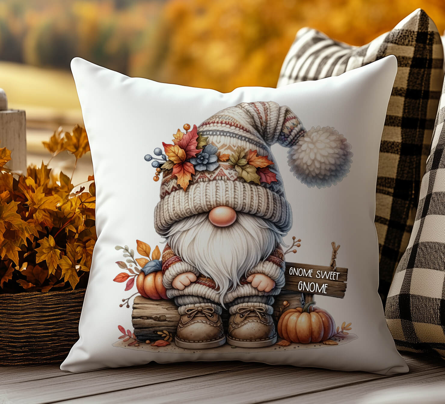 🎨 Vibrant Design – Cozy gnome artwork with pumpkins and fall foliage.