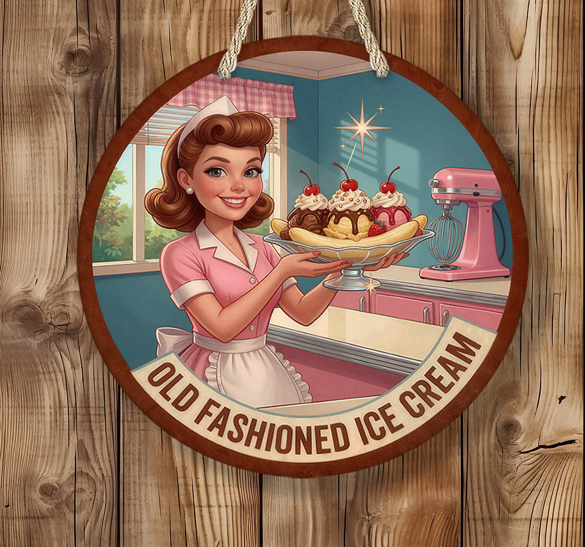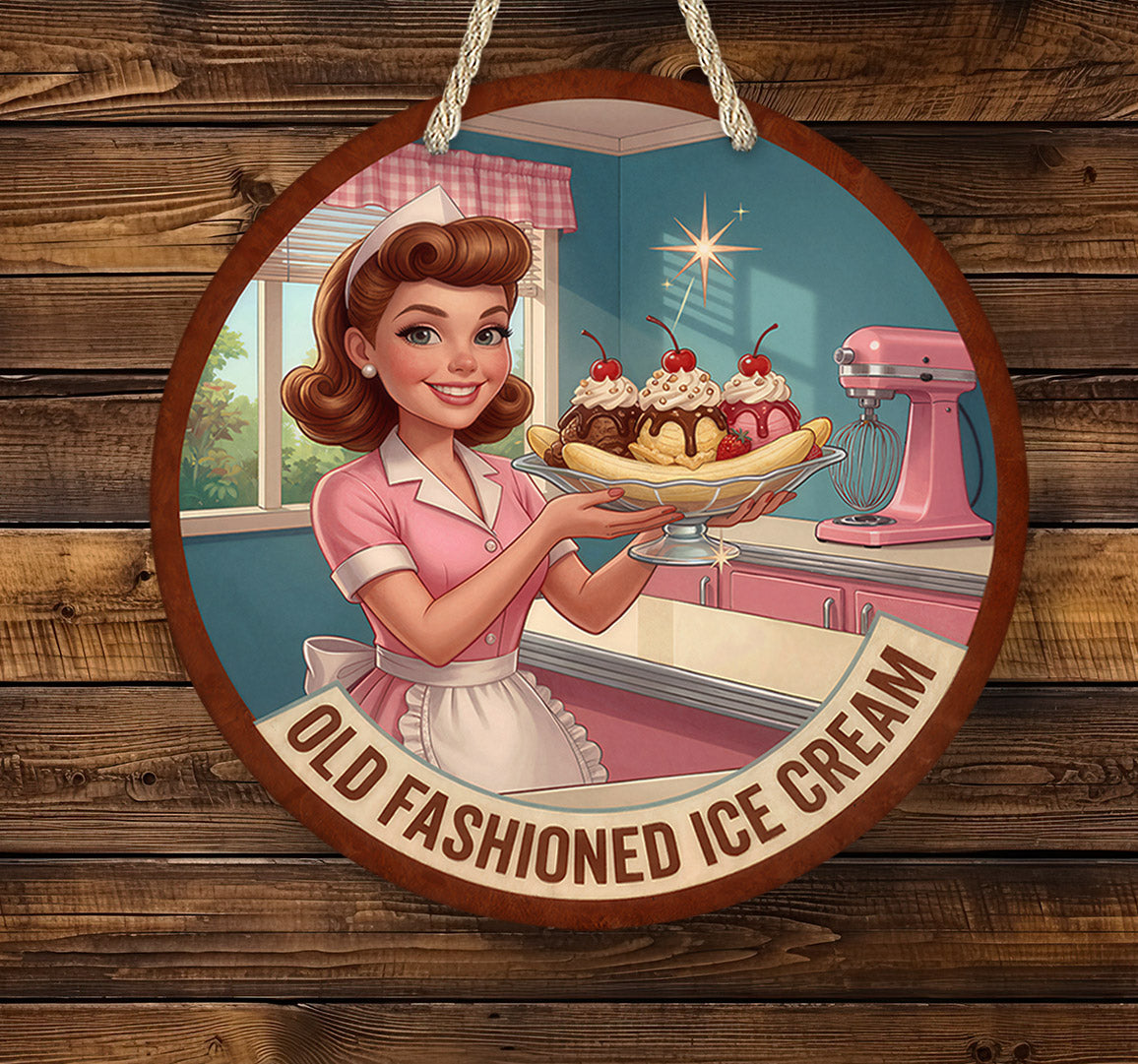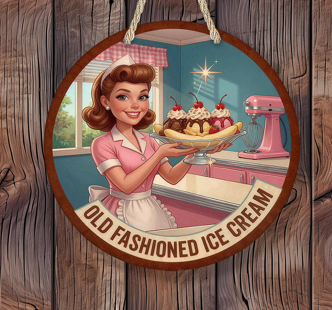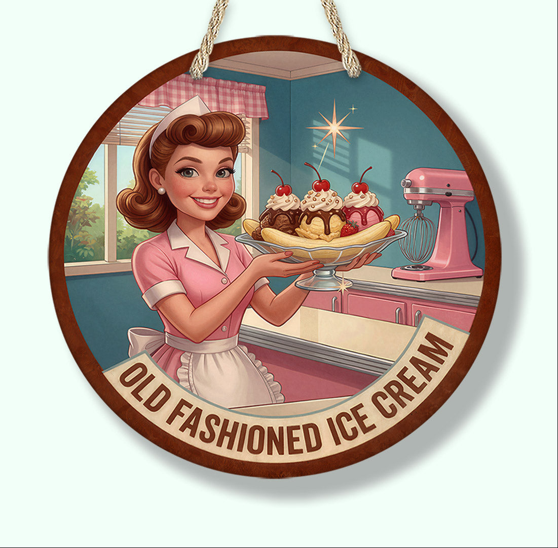 Add nostalgic diner charm to your space with this retro old fashioned ice cream diner sign featuring a classic 1950s waitress serving a banana split. Inspired by vintage American diners and mid-century restaurant advertising, this sign adds bold retro personality to kitchens, restaurants, and man caves.