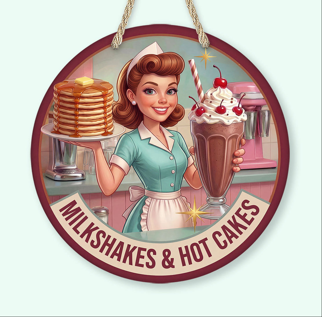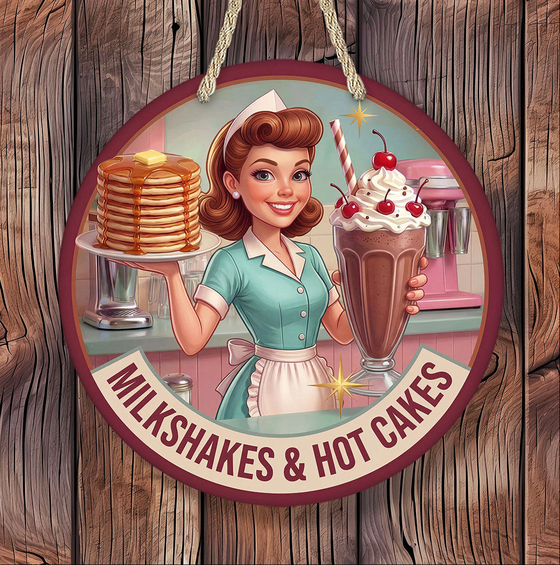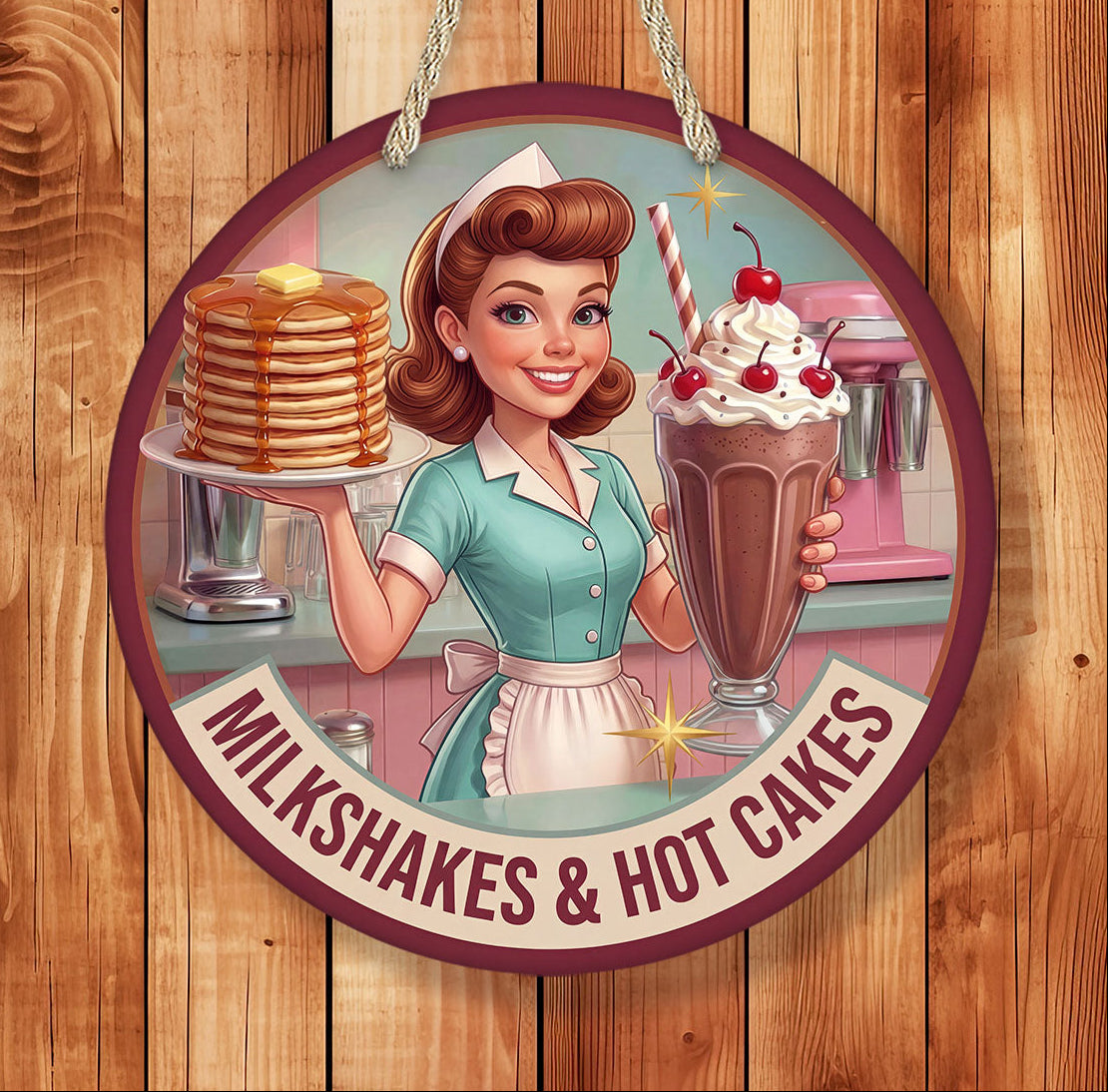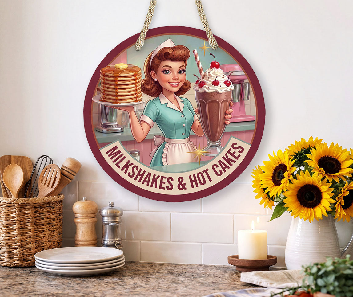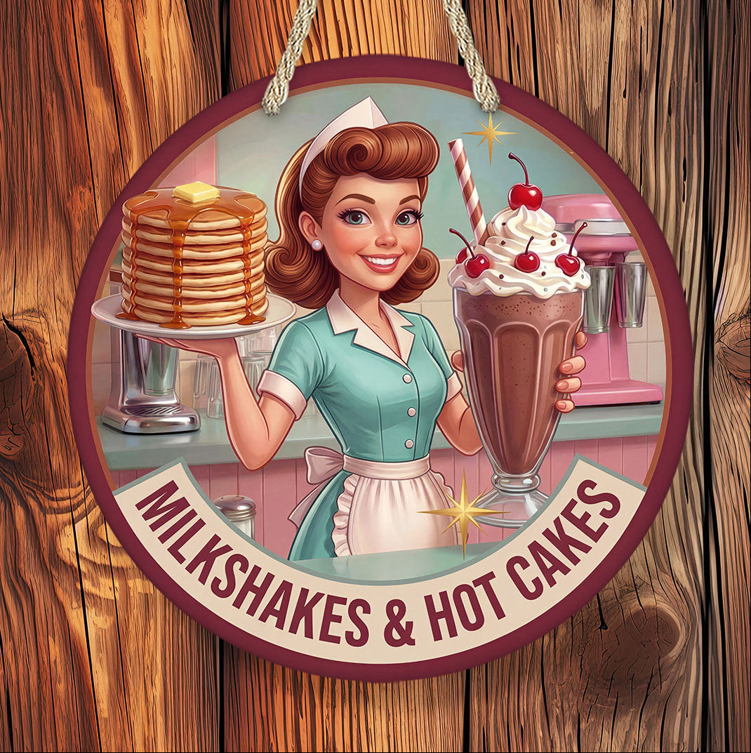 Retro milkshakes and hot cakes diner sign inspired by classic 1950s diners. Perfect vintage kitchen decor, cafe wall art, or restaurant decor.Bring nostalgic charm to your kitchen, diner space, or restaurant with this retro milkshakes and hot cakes diner sign inspired by classic 1950s American diners.
